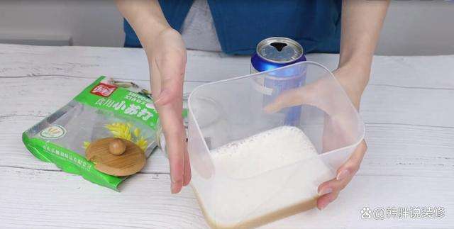 把準備好的小蘇打、食鹽一起倒進容器里面,再加入一杯左右的啤酒。靜置一小會兒,小蘇打、食鹽、啤酒就會出現反應,產生一些小氣泡。